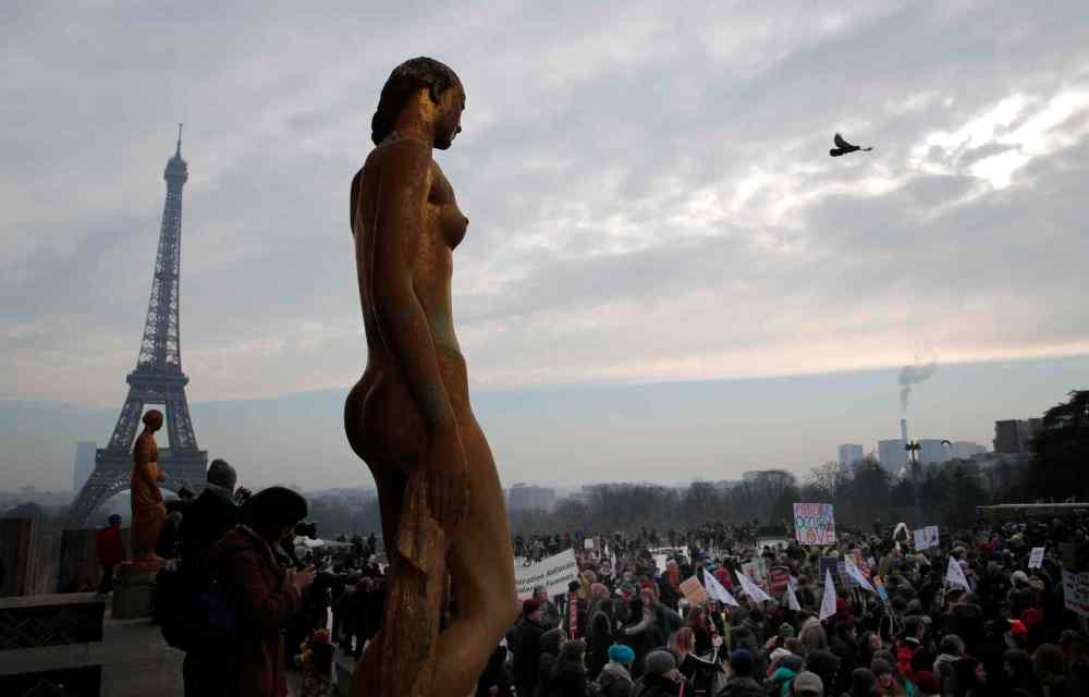 Protesters carrying banners and placards take part in a Women's March next to the Eiffel Tower, in Paris, France, Saturday, Jan. 21, 2017. The march is part of a worldwide day of actions following the inauguration of U.S President Donald Trump. (AP Photo/Christophe Ena)