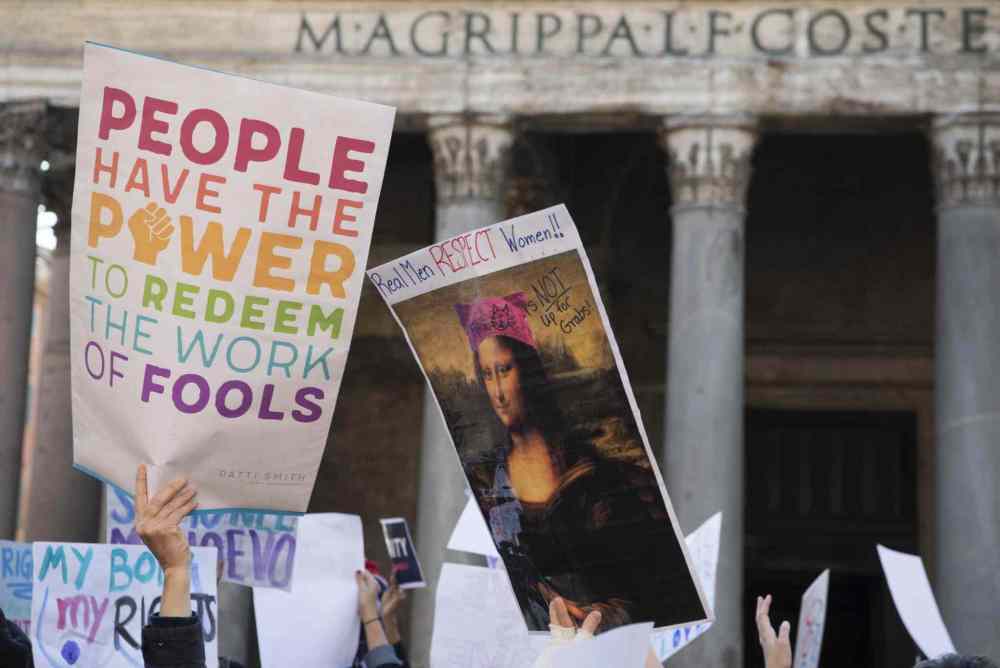 CP Participants turn out by the hundreds for the women's march in front of the Pantheon in Rome, Saturday, Jan. 21, 2017. Rallies or marches were scheduled to take place in many cities around the world the day after the inauguration of Donald Trump as new President of the United States. (Maurizio Brambatti/ANSA via AP)