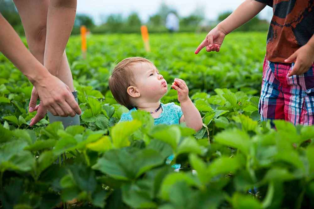 One-year-old Olivia Mitchell, is offered strawberries by her mom and older brother at Cormier's Berry Patch, just outside of La Salle, on Tuesday, July 3, 2018.RUTH BONNEVILLE / WINNIPEG FREE PRESS