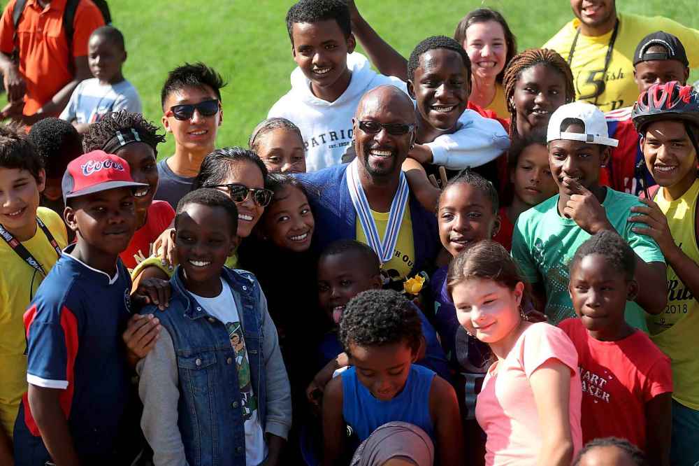 Ken Opaleke, executive director of the West Broadway Youth Outreach organization is mobbed after he, and 11 others received the Order of Manitoba during a ceremony at the Legislative Building, Thursday, July 12, 2018.ANDREW RYAN / WINNIPEG FREE PRESS
