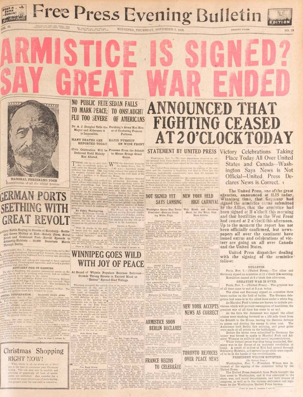 Shortly after 11 a.m. on Nov. 7, the Manitoba Free Press (as it was then called) published an extra edition that was sold downtown, with a banner headline proclaiming that an armistice had been signed. The Great War was over! Downtown stores and offices closed their doors. People converged on Portage and Main to celebrate.