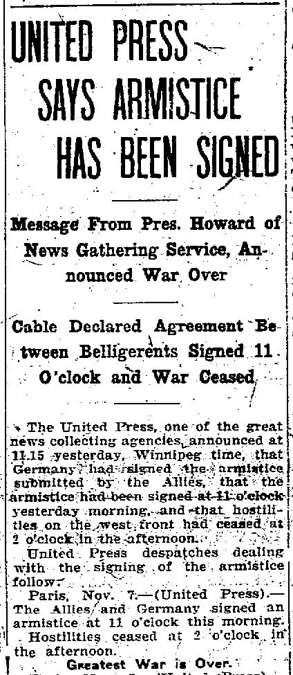By the time the Free Press issued its Evening Bulletin, later that day, the headline had been changed to “ARMISTICE IS SIGNED?” (Note the question mark.)