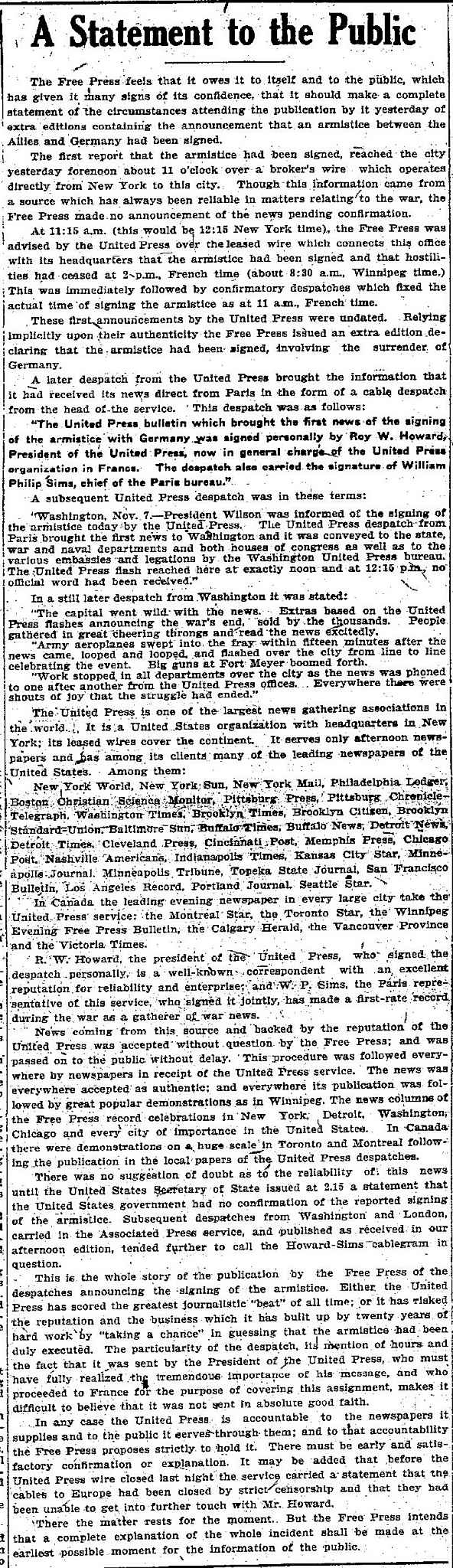 And then the Winnipeg Tribune added to the confusion, because of a comedy of errors. The Tribune had pre-printed a stock of extra papers to be ready when the news of peace actually came. A Tribune newsboy, seeing the Free Press on the street with its news about the end of the war, grabbed those pre-printed extras and started selling them. The later, real editions of the Tribune would cast doubt on the Free Press report.
