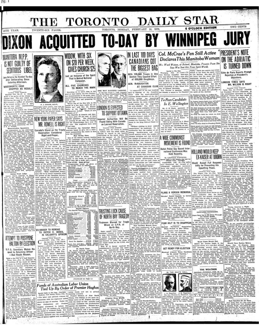 As a result of the Dixon verdict, the Crown decided not to proceed with the seditious libel case against the other person who had been charged, J.S. Woodsworth. Woodsworth was subsequently elected to Parliament, became the first leader of the federal Co-operative Commonwealth Federation (CCF), and the rest of that story is, as they say, truly history.
