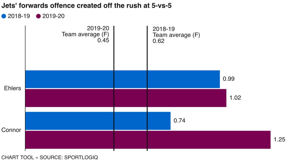 Another impact of Ehlers’ strong play this season has been his effect on Connor, who wasn’t a poor transition player last season, but has jumped up to be the second-best forward on the roster this season.