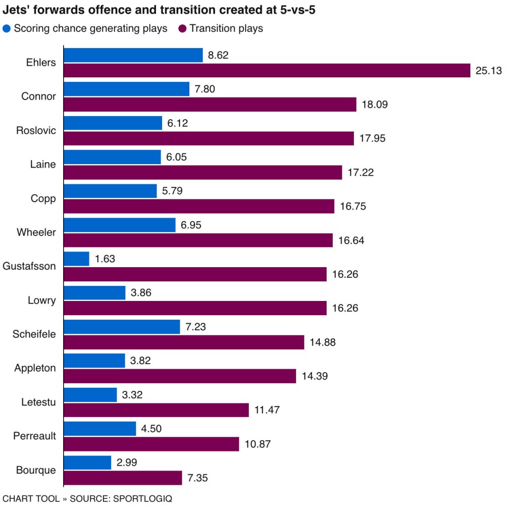 Ehlers is not only leading the Jets in plays that produce scoring chances, but blowing the entire forward group out of the water with his ability to transition the puck up the ice.