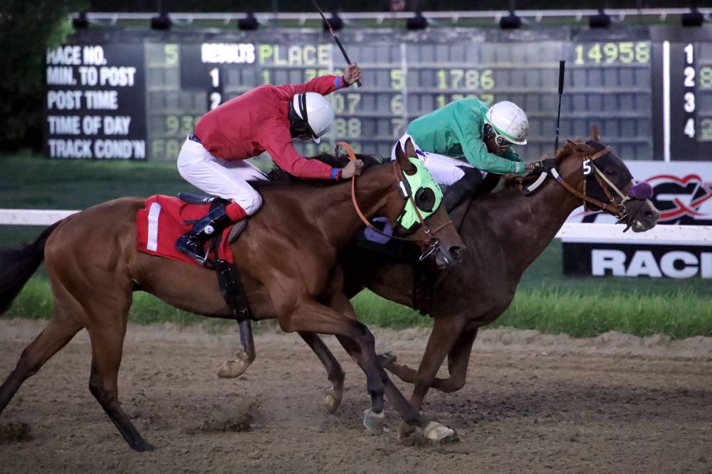 Mucho Express, ridden by jockey Antonio Whitehall (right), runs to victory in the fifth race at Assiniboia Downs on July 20, a maiden claiming race with a purse of $10,000. King Witt, ridden by jockey Sheldon Chickeness (left) finished a close second, after pulling up while leading down the stretch.