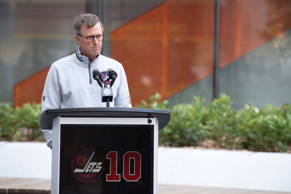 So, too, did Jets chairman and co-owner Mark Chipman. He doesn’t do many interviews these days, but I did get the chance to ask him a couple questions as part of a scrum on Saturday. The man who kept pro hockey going in this market after the original team took off to the desert in 1996, who brokered the move from the old Winnipeg Arena to the current building downtown, who partnered with billionaire David Thomson to buy the Atlanta Thrashers and who is now overseeing the True North Square development, was the architect of the Hawerchuk tribute.