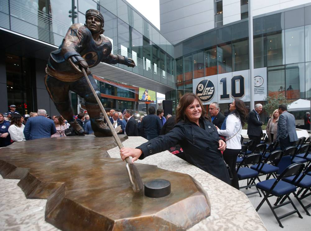 JOHN WOODS / THE CANADIAN PRESS Crystal Hawerchuk poses with the statue of her late husband and former Winnipeg Jets star Dale Hawerchuk on Saturday.