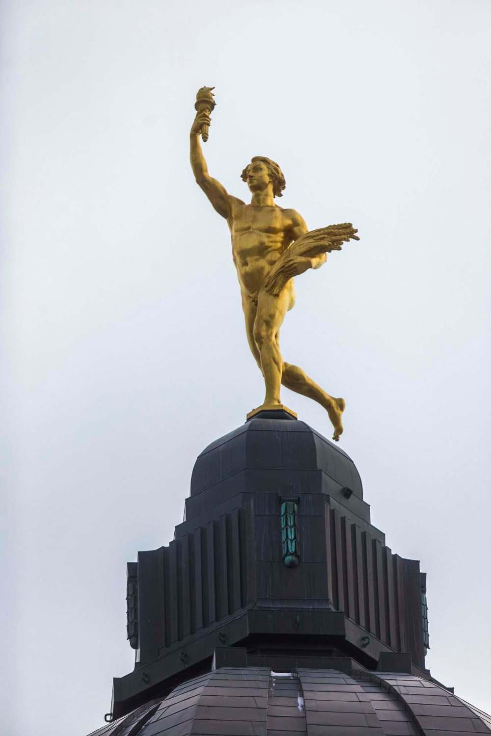 For people whose livelihoods depend on the province’s economic success, the Golden Boy still stands on its initial assignment of symbolizing the spirit of capitalism. He carries a sheaf of wheat to represent commerce and a torch to represent enterprise. While some initial planners might have considered erecting the statue facing south, toward the sun, it was instead positioned northward, to where Manitoba’s future prosperity was thought to lie.