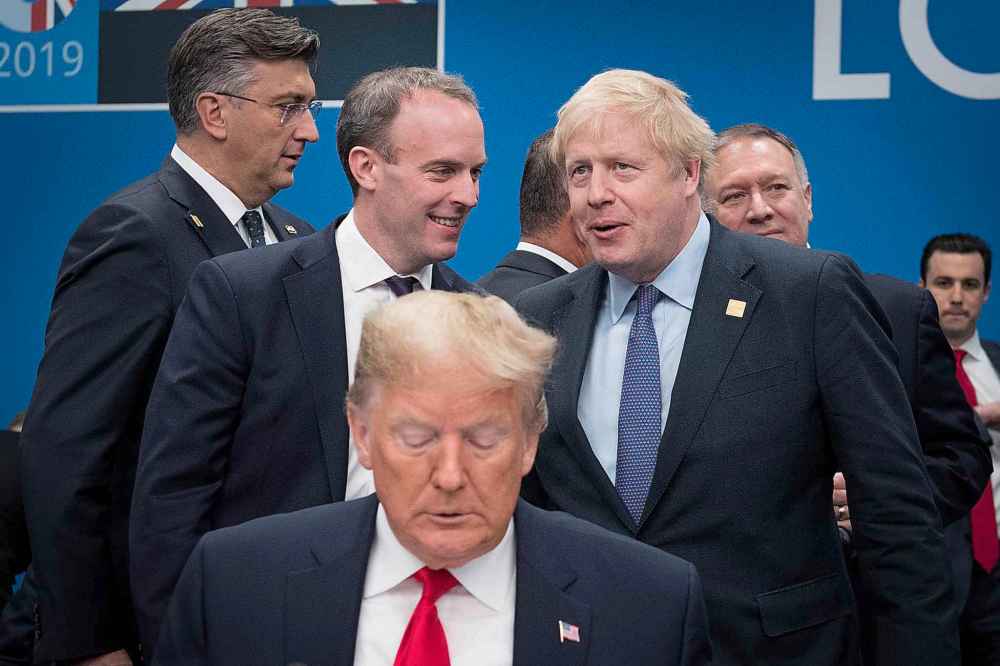 Tribune Media TNS U.S. President Donald Trump, front, with Foreign Secretary Dominic Raab and British Prime Minister Boris Johnson onstage during the annual NATO heads of government summit on Wednesday, Dec. 4, 2019 in Watford, England. (Stefan Rousseau / Canadian Press)