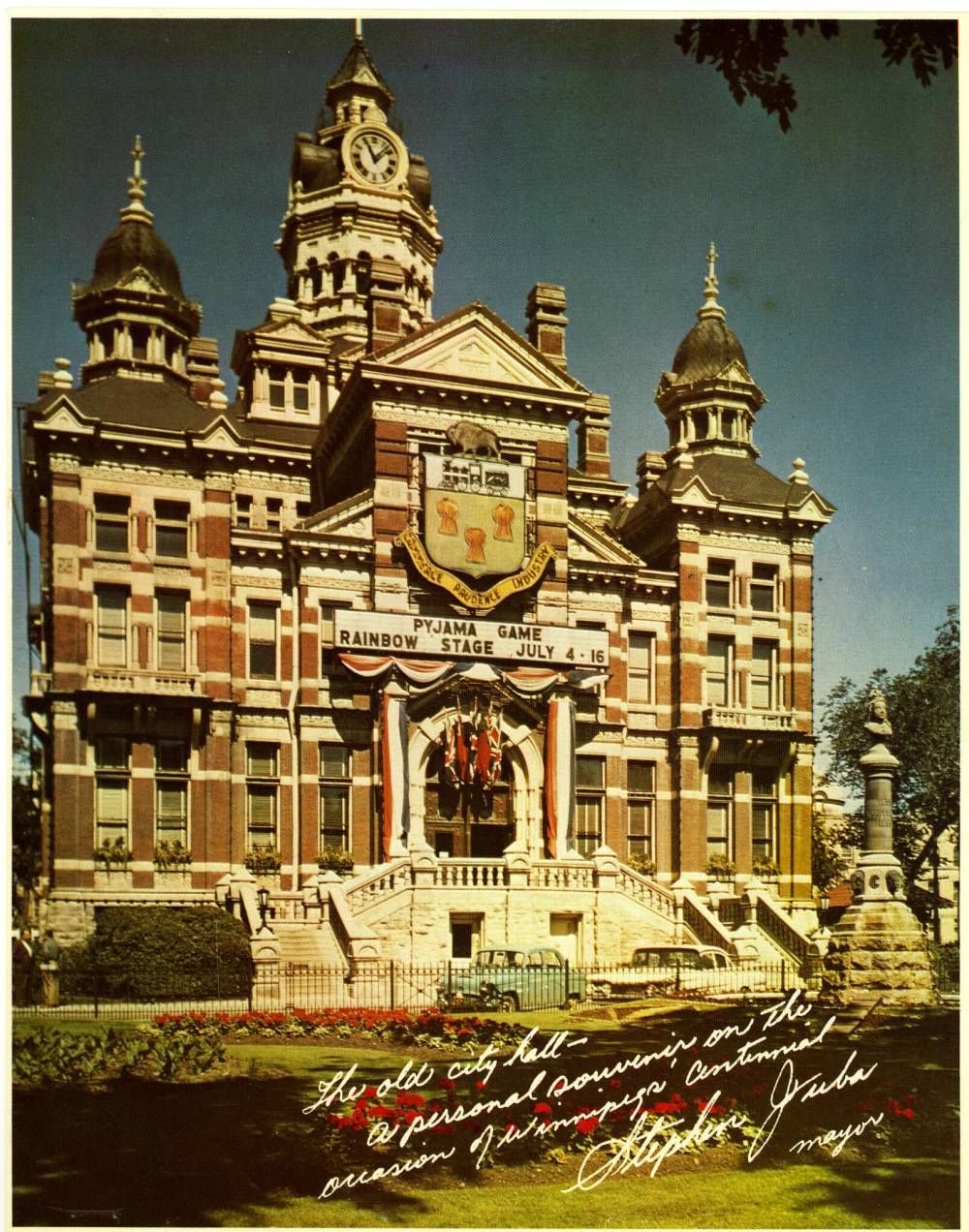 Winnipeg’s old ‘gingerbread’ city hall, featuring clockworks first installed in 1903, is depicted in this colour photo signed by former mayor Stephen Juba. The clockworks were included in the Edmonton Court clock at Portage Place and their future is unclear now the mall is being redeveloped.