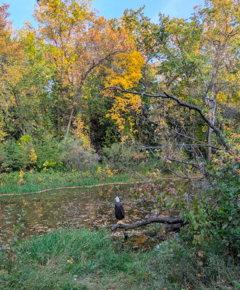 A carved wooden owl, eagle and pelican (above) are delightful works of public art along the Bois-des-Esprit trail.