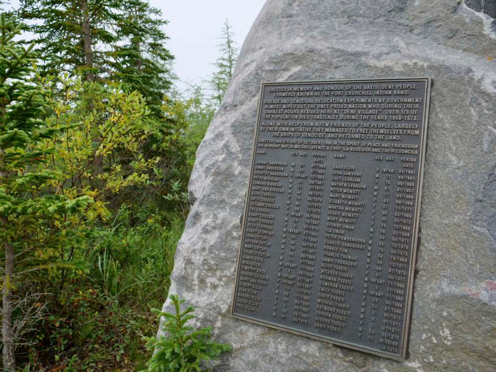“Disease and genocidal relocation experiments by government almost wiped out the once proud nation who during their darkest hours resided here at ‘Dene Village,’” the plaque reads, along with 56 names of people who lost their lives here between 1956 and 1973; about half of the total number of deaths.