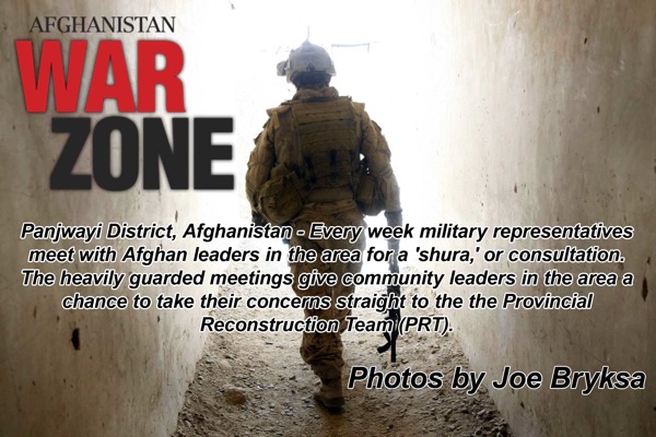 JOE BRYKSA/WINNIPEG FREE PRESS WINNIPEG OUT-Panjwayi District, Afghanistan- CAnadian soldier from 2PPCLI from Shilo, Manitoba makes his way towards meeting. Afghanistan§ leaders from across the area gathered as they do each week for a shura a word for "consultation".. A guarded meeting where locals bring concerns§ to the Provincial Reconconstruction Team (PRT) and§ military representatives.- Aug 07, 2008JOE BRYKSA/WINNIPEG FREE PRESS WINNIPEG OUT-Panjwayi District, Afghanistan- Canadian soldier from 2PPCLI from Shilo, Manitoba guards area as we arrive at meeting . Afghanistan§ leaders from across the area gathered as they do each week for a shura a word for "consultation".. A guarded meeting where locals bring concerns§ to the Provincial Reconconstruction Team (PRT) and§ military representatives.- Aug 07, 2008JOE BRYKSA/WINNIPEG FREE PRESS WINNIPEG OUT-Panjwayi District, Afghanistan- Afghanistan§ leaders from across the area gathered as they do each week for a shura a word for "consultation".. A guarded meeting where locals bring concerns§ to the Provincial Reconstruction Team (PRT) and§ military representatives. Canadian military secure area before meeting as Afghanistan National Police roll by- Aug 07, 2008JOE BRYKSA/WINNIPEG FREE PRESS WINNIPEG OUT-Panjwayi District, Afghanistan- Sign outside on wall warns that no weapons allowed. Afghanistan§ leaders from across the area gathered as they do each week for a shura a word for "consultation".. A guarded meeting where locals bring concerns§ to the Provincial Reconconstruction Team (PRT) and§ military representatives. - Aug 07, 2008JOE BRYKSA/WINNIPEG FREE PRESS WINNIPEG OUT-Panjwayi District, Afghanistan- All Afgans go barefoot to shura. Afghanistan§ leaders from across the area gathered as they do each week for a shura a word for "consultation".. A guarded meeting where locals bring concerns§ to the Provincial Reconconstruction Team (PRT) and§ military representatives.- Aug 07, 2008JOE BRYKSA/WINNIPEG FREE PRESS WINNIPEG OUT-Panjwayi District, Afghanistan-A Canadian Forces soldier talks to Afghanistan leaders. Afghanistan§ leaders from across the area gathered as they do each week for a shura a word for "consultation".. A guarded meeting where locals bring concerns§ to the Provincial Reconconstruction Team (PRT) and§ military representatives.- Aug 07, 2008JOE BRYKSA/WINNIPEG FREE PRESS WINNIPEG OUT-Panjwayi District, Afghanistan-.Afghanistan§ leaders from across the area gathered as they do each week for a shura a word for "consultation".. A guarded meeting where locals bring concerns§ to the Provincial Reconconstruction Team (PRT) and§ military representatives.- ( Note faces of those who can not be indentified have been blurred)- Aug 07, 2008JOE BRYKSA/WINNIPEG FREE PRESS WINNIPEG OUT-Panjwayi District, Afghanistan- Afghanistan§ leaders from across the area gathered as they do each week for a shura a word for "consultation".. A guarded meeting where locals bring concerns§ to the Provincial Reconconstruction Team (PRT) and§ military representatives.- Aug 07, 2008JOE BRYKSA/WINNIPEG FREE PRESS WINNIPEG OUT-Panjwayi District, Afghanistan- A Afghanistan Community leader listens to talk.- Afghanistan§ leaders from across the area gathered as they do each week for a shura a word for "consultation".. A guarded meeting where locals bring concerns§ to the Provincial Reconconstruction Team (PRT) and§ military representatives.- Aug 07, 2008JOE BRYKSA/WINNIPEG FREE PRESS WINNIPEG OUT-Panjwayi District, Afghanistan-Afghanistan community leader listens to meeting. Afghanistan§ leaders from across the area gathered as they do each week for a shura a word for "consultation".. A guarded meeting where locals bring concerns§ to the Provincial Reconconstruction Team (PRT) and§ military representatives.- Aug 07, 2008JOE BRYKSA/WINNIPEG FREE PRESS WINNIPEG OUT-Panjwayi District, Afghanistan- A leaders weathered feet as Afghanistan§ leaders from across the area gathered as they do each week for a shura a word for "consultation".. A guarded meeting where locals bring concerns§ to the Provincial Reconconstruction Team (PRT) and§ military representatives.- Aug 07, 2008JOE BRYKSA/WINNIPEG FREE PRESS WINNIPEG OUT-Panjwayi District, Afghanistan- Afghanistan§ leaders from across the area gathered as they do each week for a shura a word for "consultation".. A guarded meeting where locals bring concerns§ to the Provincial Reconconstruction Team (PRT) and§ military representatives.- Aug 07, 2008JOE BRYKSA/WINNIPEG FREE PRESS WINNIPEG OUT-Panjwayi District, Afghanistan- A Afghanistan National Army member keeps eye on meeting. Afghanistan§ leaders from across the area gathered as they do each week for a shura a word for "consultation".. A guarded meeting where locals bring concerns§ to the Provincial Reconconstruction Team (PRT) and§ military representatives.- Aug 07, 2008JOE BRYKSA/WINNIPEG FREE PRESS WINNIPEG OUT-Panjwayi District, Afghanistan- Afghanistan§ leaders from across the area gathered as they do each week for a shura a word for "consultation".. A guarded meeting where locals bring concerns§ to the Provincial Reconconstruction Team (PRT) and§ military representatives.- Aug 07, 2008JOE BRYKSA/WINNIPEG FREE PRESS WINNIPEG OUT-Panjwayi District, Afghanistan-A Afghanistan community leader listens to talks- Afghanistan§ leaders from across the area gathered as they do each week for a shura a word for "consultation".. A guarded meeting where locals bring concerns§ to the Provincial Reconconstruction Team (PRT) and§ military representatives.- Aug 07, 2008JOE BRYKSA/WINNIPEG FREE PRESS WINNIPEG OUT-Panjwayi District, Afghanistan- Afghanistan§ leaders from across the area gathered as they do each week for a shura a word for "consultation".. A guarded meeting where locals bring concerns§ to the Provincial Reconconstruction Team (PRT) and§ military representatives.- ( EDS note face blurred of man who can not be identified) 