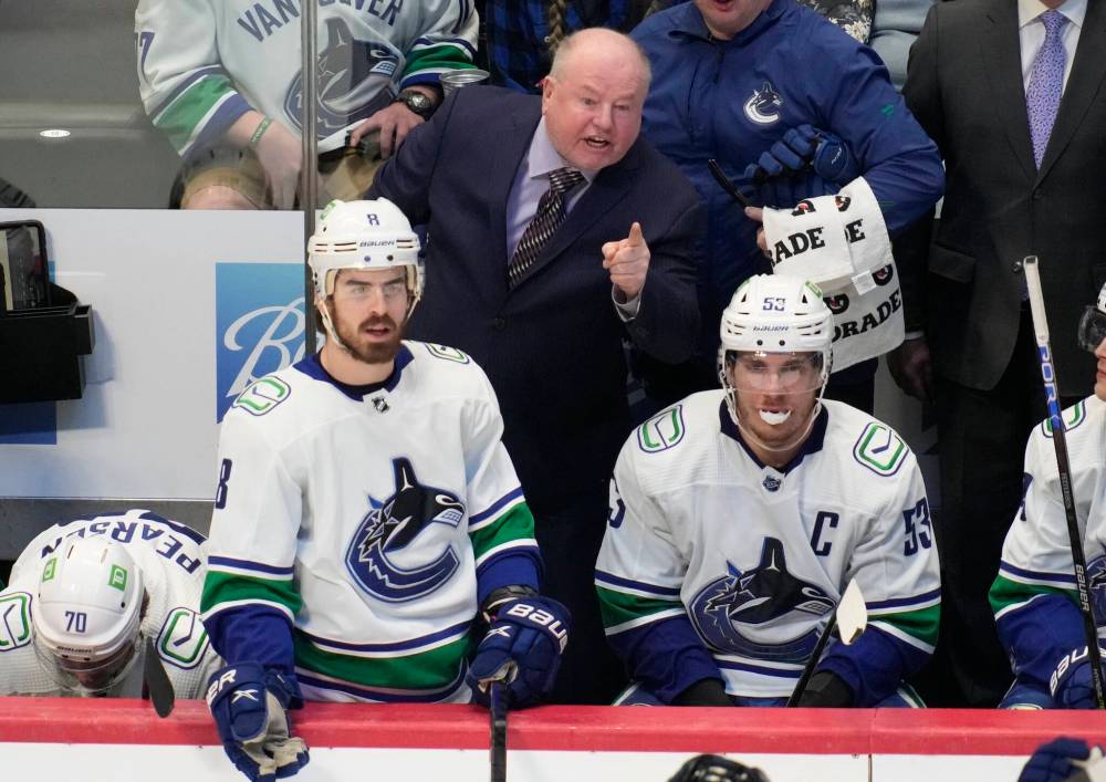 Bruce Boudreau (centre) says he hasn’t seen anything to indicate the Jets have stopped trying to win.
