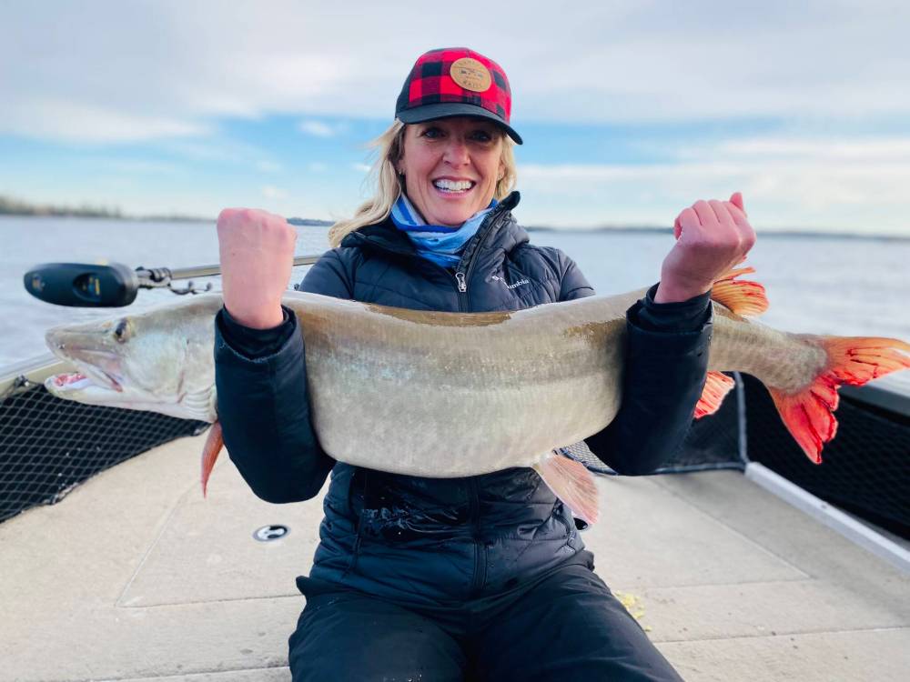 Susan Tinsley poses with a photo of a freshly caught muskellunge (muskie). Forward Facing Sonar has changed not only the odds of interactions with a wild fish, but also how these fish can be manipulated.
