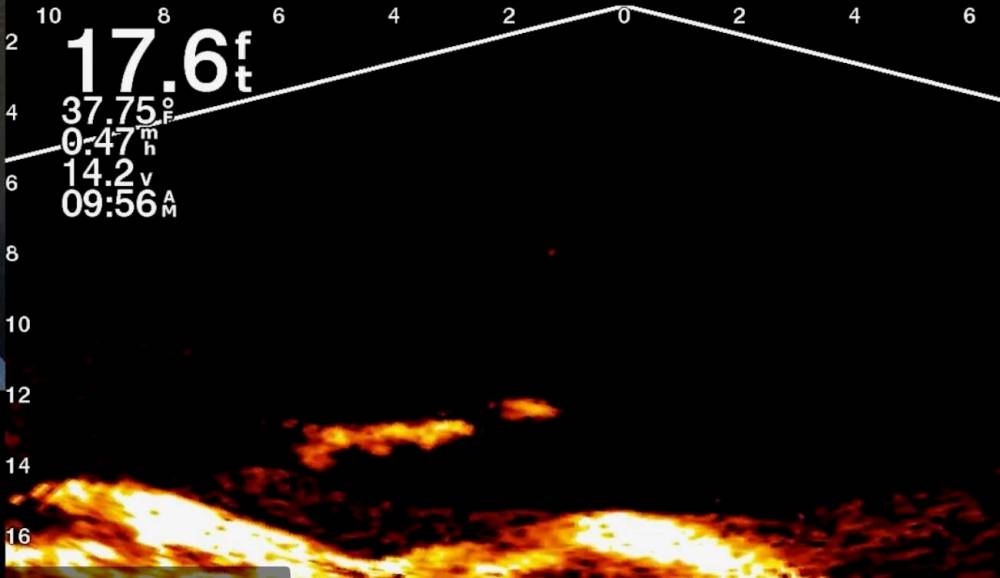 Image from a Forward Facing Sonar monitor screen. The technology uses live images in a real time feed rather than historical data, as is the case with traditional sonar.