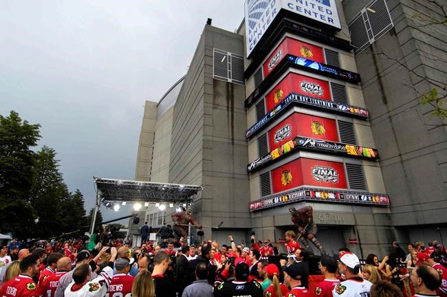 FILE - In this June 8, 2015, file photo, hockey fans gather around former Chicago Blackhawk Jeremy Roenick outside the United Center before Game 3 of the NHL hockey Stanley Cup Final against the Tampa Bay Lightning, in Chicago. The United Center is one of the possible locations the NHL has zeroed in on to host playoff games if it can return amid the coronavirus pandemic. The league will ultimately decide on two or three locations for games, with government regulations, testing and COVID-19 frequency among the factors for the decision that should be coming within the next three to four weeks. (John Starks/Daily Herald via AP, File)