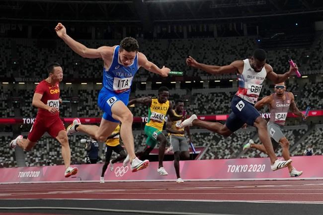 Filippo Tortu, of Italy, crosses the finish line ahead of Nethaneel Mitchell-Blake, of Britain, to lead his to team a gold medal in the men's 4x100-meter relay at the 2020 Summer Olympics, Friday, Aug. 6, 2021, in Tokyo. (AP Photo/David J. Phillip)