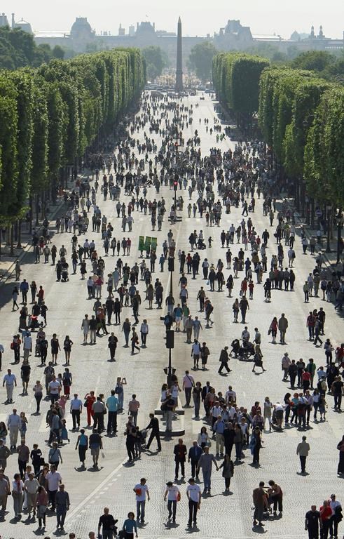 FILE- Visitors walk towards planted fields on the Champs Elysees near the "Place de la Concorde" (Concorde's square) monument in Paris, Sunday, May 23, 2010. Some 4,400 of the world's best athletes, parading down France's most famous boulevard with their prosthetic limbs, mobility chairs and stories of adversities overcome, to a grand celebration of their prowess and sports on the Paris square where the French revolutionaries of 1789 chopped off heads. (AP Photo/Jacques Brinon, File)